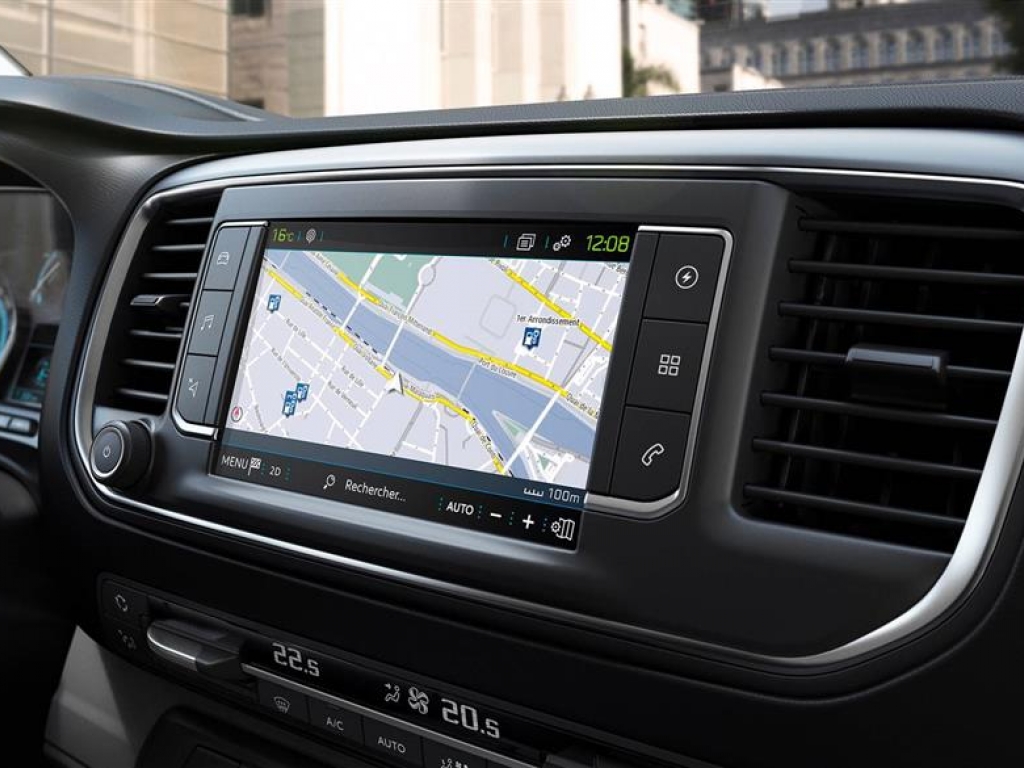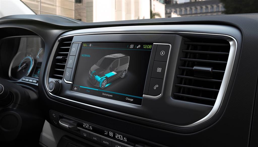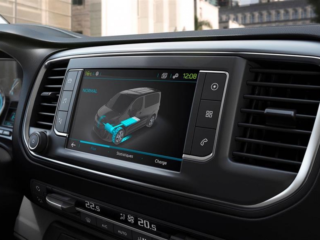 A PEUGEOT e-Expert új, 3,5" méretű színes kijelzőjén a vezetéshez szükséges információkat láthatja, mint a még megtehető hatótávolság vagy az aktuális energia felhasználást (charge/eco/power állapoti).