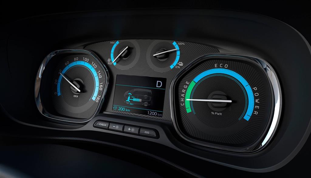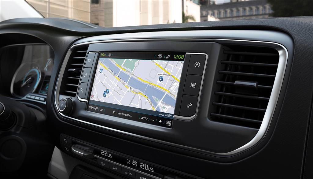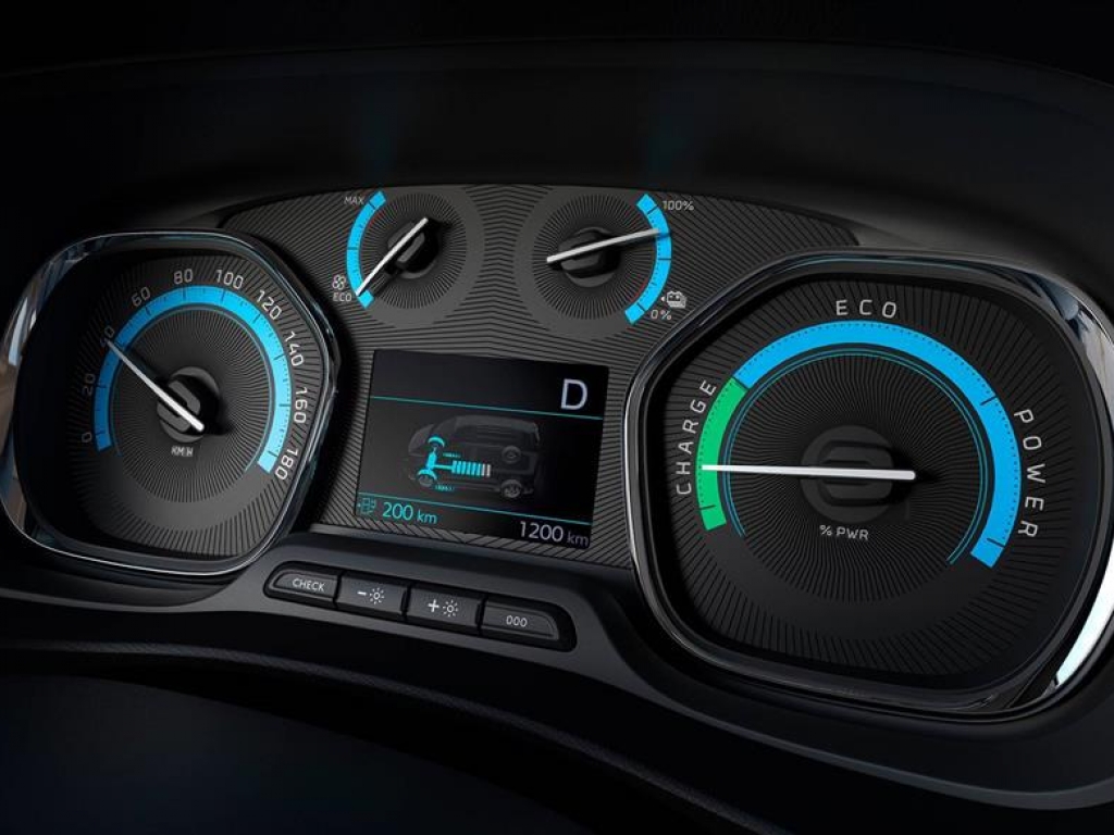 A PEUGEOT e-Expert új, 3,5" méretű színes kijelzőjén a vezetéshez szükséges információkat láthatja, mint a még megtehető hatótávolság vagy az aktuális energia felhasználást (charge/eco/power állapoti).